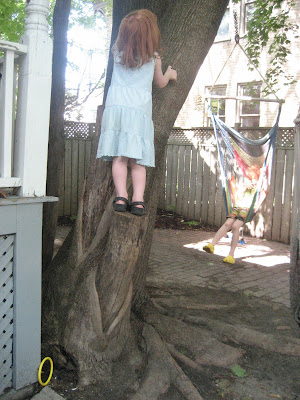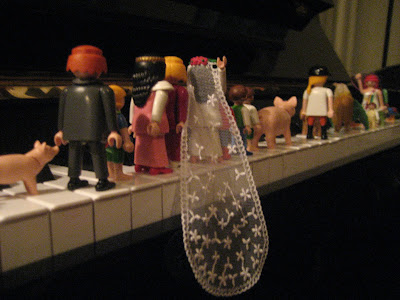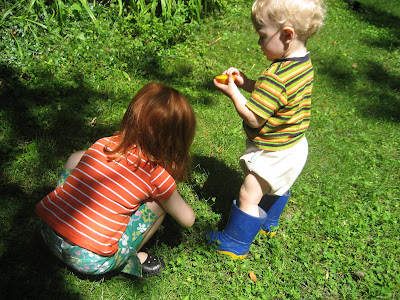 A few images from our week: the ever-classic diaper and rubber boots combo; a Playmobil scene awaiting post-bedtime discovery on the piano keys (and how apropos, as we look forward to the wedding of “Uncle Chach and B” this coming weekend); the girls and their hair (I’ve never been much of a girlie girl, but it feels like I’m living out a little girl’s fantasy of playing with gorgeous dollies when I brush and braid their tresses); Fooey wanting to stand on the tree stump by the porch, then deciding perhaps she prefers firm land; and Albus post-emergency room, with the gash on his forehead tidily closed. He and Kevin were up till midnight waiting and then being treated, but did he sleep in this morning? You know the answer to that.
