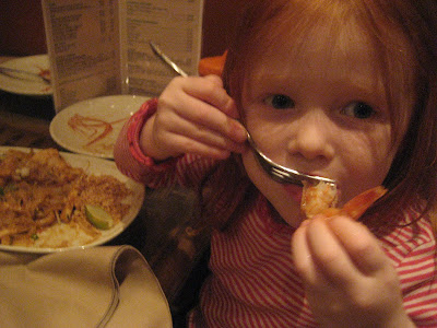 And by solo, I mean one parent with four children. Pictured above is last night’s highly successful outing, wherein I silently basked in my children’s fine behavior. I didn’t put much thought into the outing, which was probably a good thing, because too much thinking and I might have thought better of it. We brainstormed places to go for supper, and agreed on a Thai restaurant within walking distance, as we had no vehicle at our disposal (Kevin is away for a few days; and this is what happens when you decide to be a one-vehicle family). Every kid chose a small entertainment item, I threw the diaper bag into the small stroller, and we headed merrily on our way. Since we arrived before 5pm on a Friday evening, we had the place to ourselves, and food arrived quickly (we are familiar with the menu and had made our meal choices beforehand). CJ is the real wild-card, but everyone was equally hungry, and we ate and talked and CJ pointed out animals in the artwork, including making loud dragon noises for the Chinese dragon (“why is a Chinese dragon at a Thai restaurant?” the older kids wondered). The photo above pictures him choking on a piece of Albus’s chicken. Awesome camera-work, Perfect Mom! Yes, he survived. We stopped at mains (no ice cream), and left the restaurant while everyone was still in happy spirits. I was one proud mama, and even got to hear an elderly woman who’d just arrived with her friends observe in an admiring voice: “Look at that woman, out all on her own with four children!”