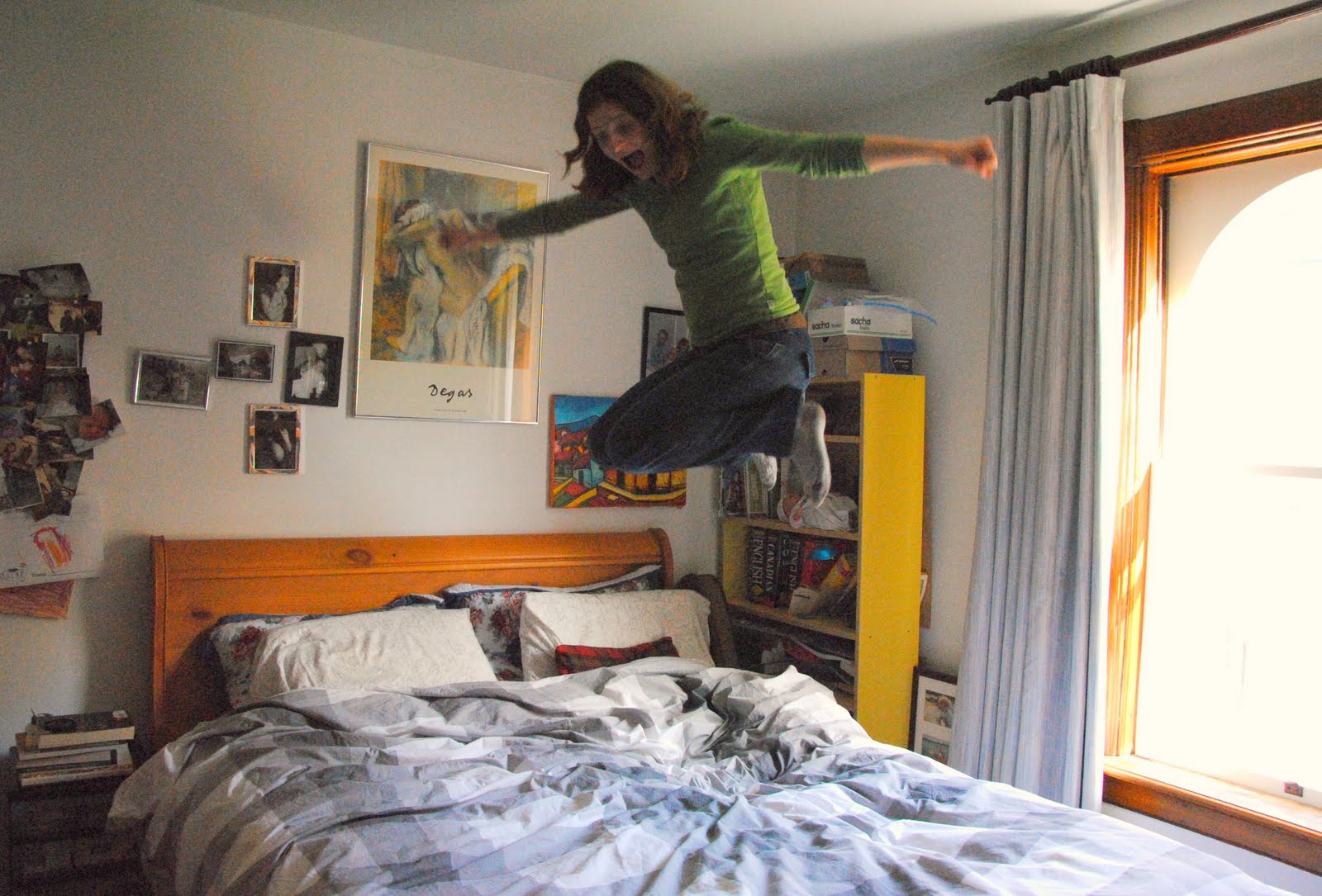 The jump! This is how I’m feeling today. I haven’t even had a cup of coffee, but it’s 10 o’clock in the morning, and the house is emptied of its usual noise. The oven is on, baking up two pans of sticky buns, and I’ve just jumped on my bed, and recorded it for posterity. Looking at that image, I think, not grown woman with four children and major life responsibilities, but girl. Sometimes it seems to me that I’m too in touch with my inner child: silly, goofy, self-involved, jumping on the bed.