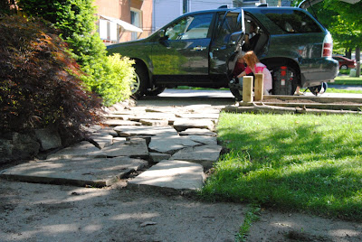 There was more to our weekend. There was another party, and (believe it or not) even more cake. And that’s our new nephew pictured above with CJ and Fooey (photo by AppleApple), who visited from afar with his mum and grandma. And Kevin built that cool-looking box for the front veggie beds, and got the stones partially laid for our new walkway. Among much much else.