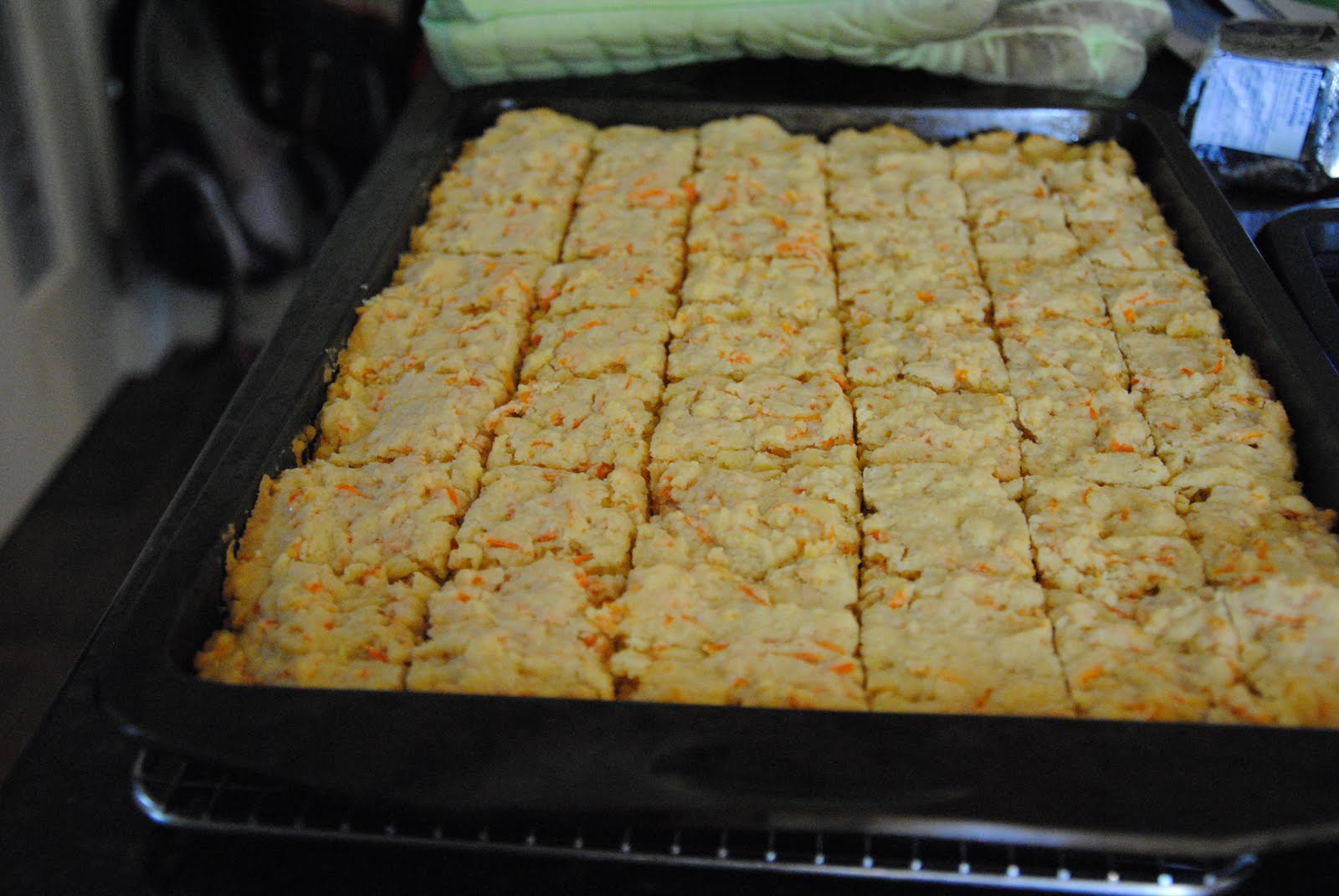 Spread on a greased cookie sheet, and bake at 350 for 20-25 minutes (in my oven, it took 23 minutes to reach buttery soft goodness). Remove from oven, cut into squares while still in the pan and hot, and let cool on the tray before removing to storage containers. In keeping with my no-pre-packaged snack plan, I’ve made up three containers with eight bars in each in preparation for piano and swimming outings (those have gone into the freezer). I also have a full container for eating and lunch boxes sitting on the counter.