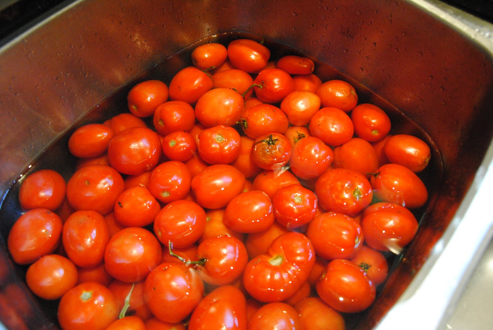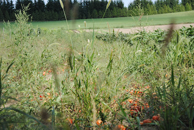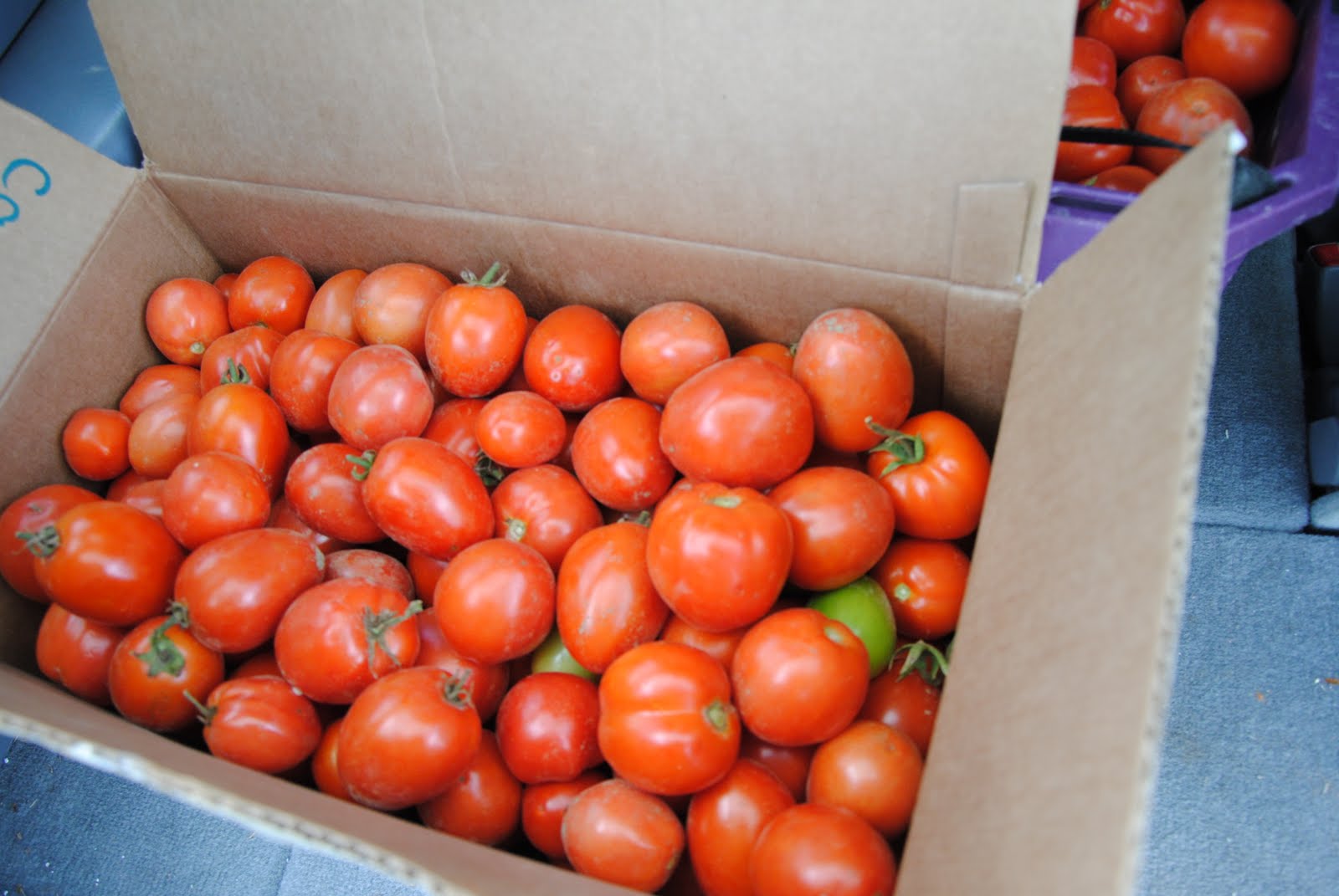 We found the field, using my googled and scribbled instructions … and by God it was beautiful. “Don’t you feel better already? Just being out here? Isn’t this wonderful?” (For which I received some muttered agreement from the masses, if not outright enthusiasm). The sun shone, the tomatoes were ripe and plentiful, so many on the vines that we had to be careful not to step on them (they are paste tomatoes and grow on vines that crawl along the ground). In forty-five minutes we had picked approximately 55 pounds of tomatoes–or one bushel. CJ was the most enthusiastic helper, which explains the number of green tomatoes in my bin. The older kids grew tired and sat in the grass under the shade. But I was positively ecstatic. Dirt, sun, sky, the scent of ripe and rotting tomatoes.