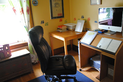 My office has been touched-up, tidied, desk debris cleared (dusty three-year-old “must-do” piles purged into the recycling bin); we purchased a proper adjustable chair (and removed the folding chair which had replaced the exercise ball both of which had rendered me nearly lame on writing week; seriously, I temporarily lost all feeling down one leg), and Kevin used the skill-saw to customize the tiny computer desk I’ve been using since 1998 (now there was a worthwhile $99.00 investment in pressed-fibre technology). And suddenly, I am sitting in well-organized comfort before my computer screen, in a sunny room that is, yes, still a playroom; but the toys are easily hidden in cupboards and closet, and the bookshelf holds kids’ books on the lower shelves and my books on the upper shelves. I’m ready for the new year.