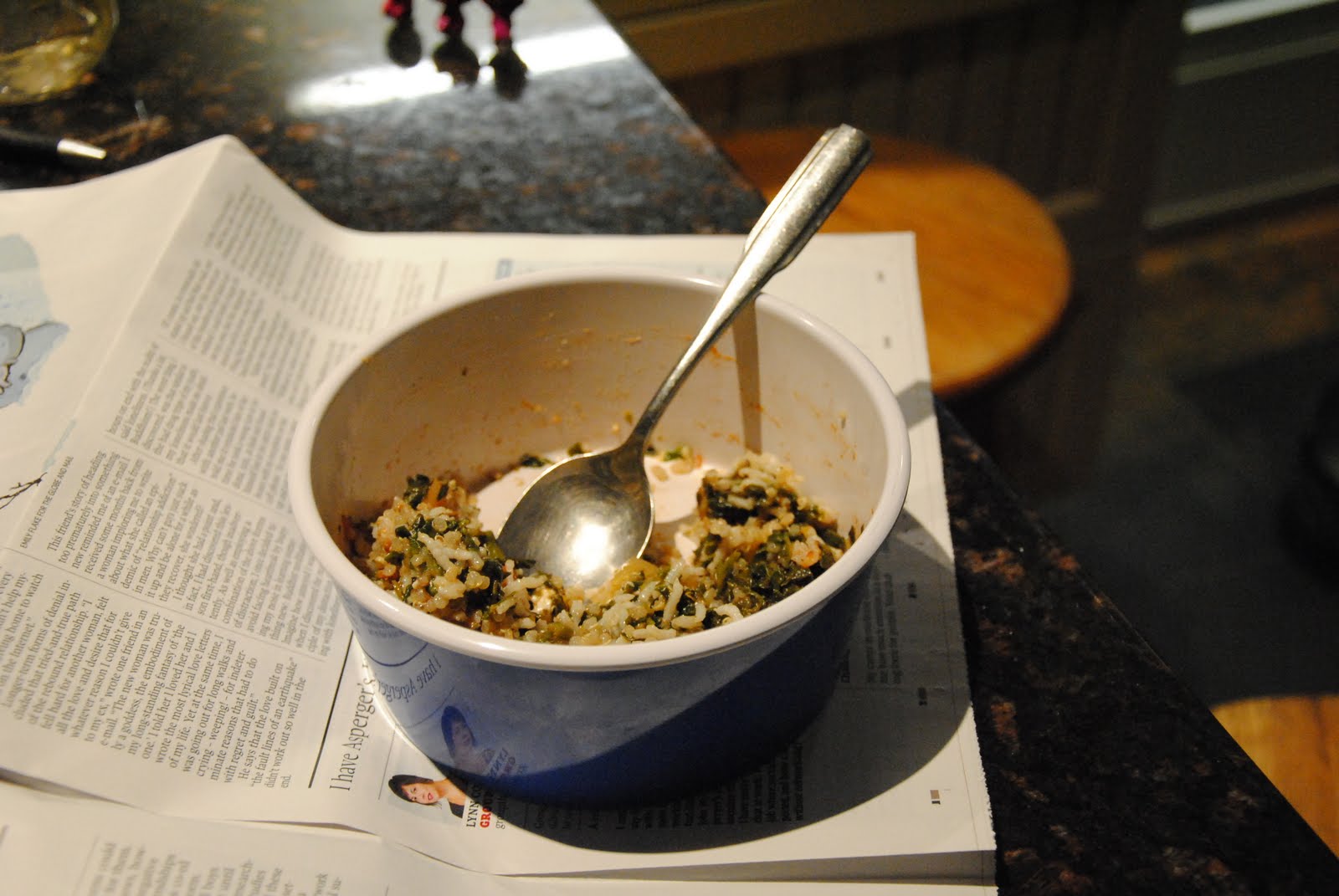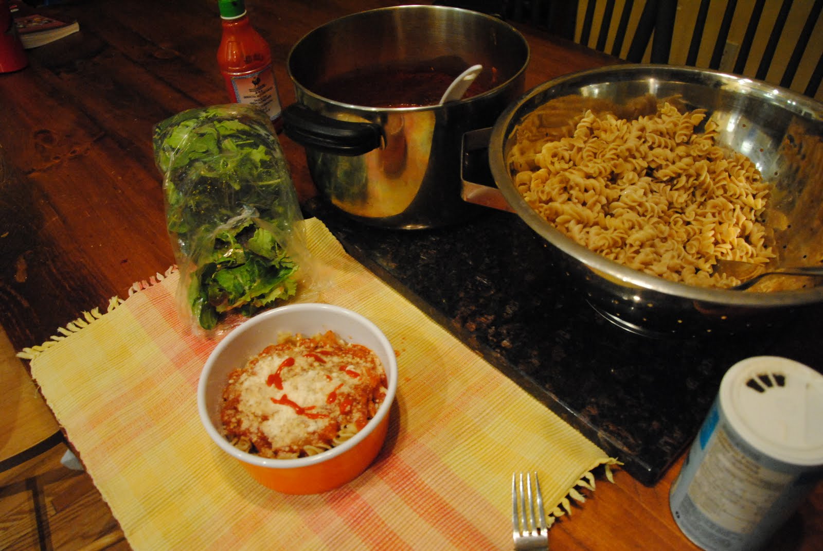 Thursday night. I ate alone. The family ate pasta with red sauce. Kevin forgot to put out the greens. I cooked up the red sauce from scratch earlier in the day, and Kevin cooked up the noodles. It’s a good meal for the evenings when I’m out at yoga class. Which is where I was. I came home, and devoured a couple of bowls of pasta, along with the greens. That night, our youngest got sick, so we cancelled our babysitter and I missed kundalini yoga.