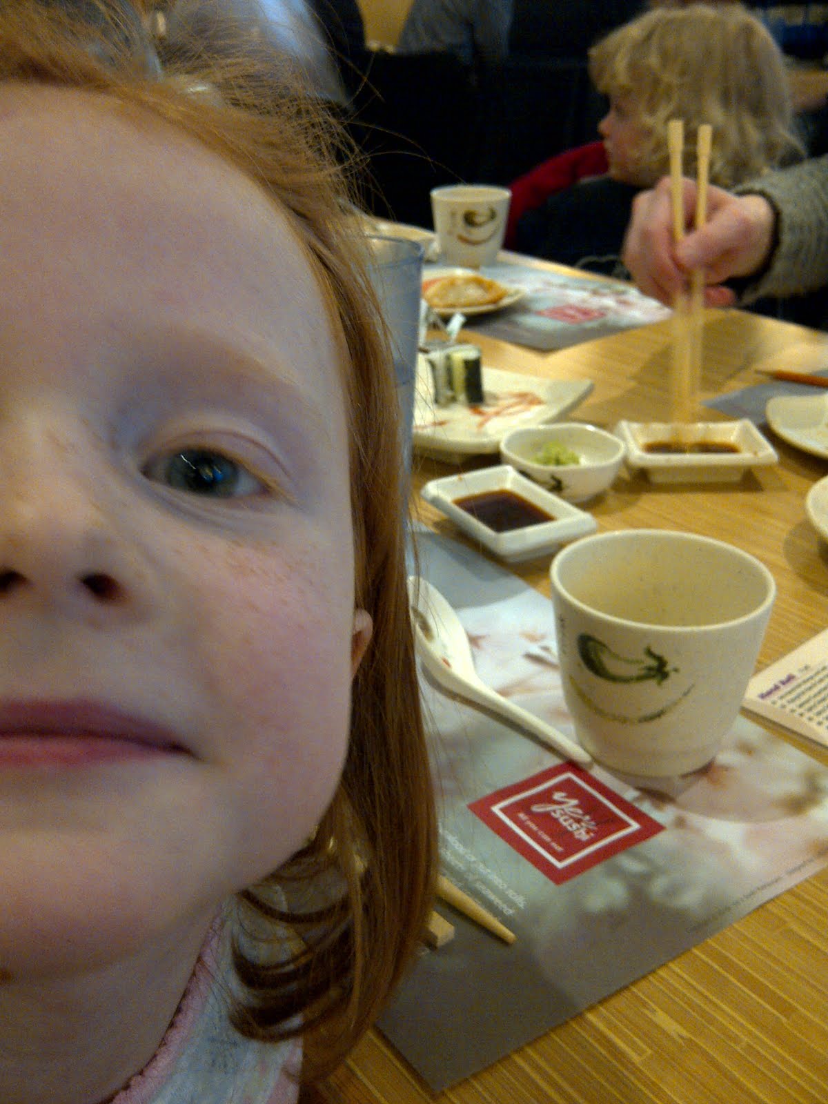 Saturday night. Supper out! We went for all-you-can-eat sushi, and ate our money’s worth. Even CJ, who was still sick, discovered a fondness for cucumber maki, and ate at least six. This was such a treat, and it felt like we were on holiday, for real. We pretended we were at Disney (a place I fully intend never to go). I don’t know why, but it really felt like we were in Florida. We stayed for almost the full time limit, and everyone was beautifully behaved, not greedy, and shared the food. When we went home, we had a family drawing time at the dining-room table, and then a short dance party in the living-room. Considering the still-sick child, and the interrupted nights, and the 16km run that took up a large part of my afternoon, it felt like a real holiday.