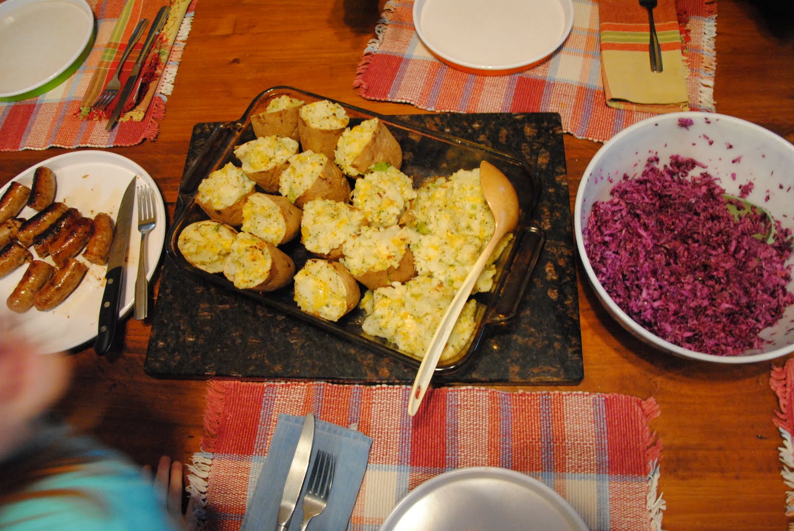 Monday night. Twice-stuffed potatoes, sausages, red cabbage salad. Potatoes leftover from Apple-Apple’s supper the night before. Excellent re-use of leftover baked potatoes, sliced in half, emptied out, insides mixed with cheese, crema, and mashed up brocolli and cauliflower. Red cabbage salad recipe from a friend (onion, mayonnaise, vinegar, and maple syrup). We cut each sausage in half, because there were only five. Kevin and I got one half each and the kids divvied up the rest.