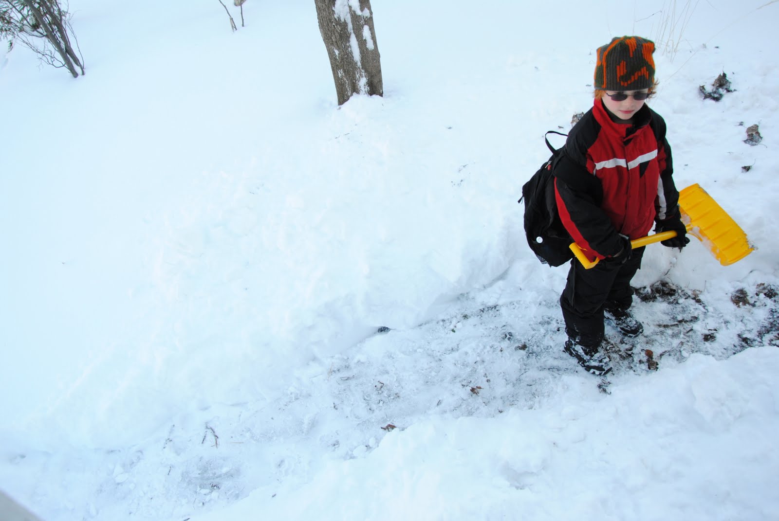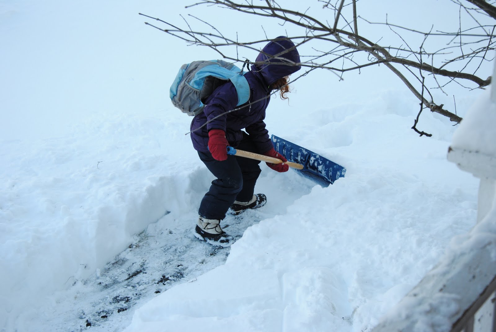 The older children apparently took my chat about responsibility to heart. Inspired by a specific garbage-dropping incident two days ago, I took the opportunity of all of us gathered for supper to explain that while I, as their mother, am happy to be responsible for many things, including feeding them and washing and folding their laundry, there were other things that were their responsibility. And then I threw the ball into their court: could they think of anything that was their responsibility more than mine? Albus instantly thought of cleaning up the water he always spills when getting himself a drink. AppleApple thought she could take her plate to the counter and scrape food into the compost. Socks in laundry basket, not chucked across the room. Banana peels composted rather than left on a bedroom floor to rot. Basic stuff, but helpful. (These supper conversations are our new version of family meetings–spontaneous topical conversations). Sometimes I feel like I’m talking to myself (though not always), but I do believe strongly that the kids are listening. Spontaneously, yesterday evening, Albus decided that shovelling the walk was something he could take some responsibility for. This morning, I found them outside early, both hard at work with school bags on backs.