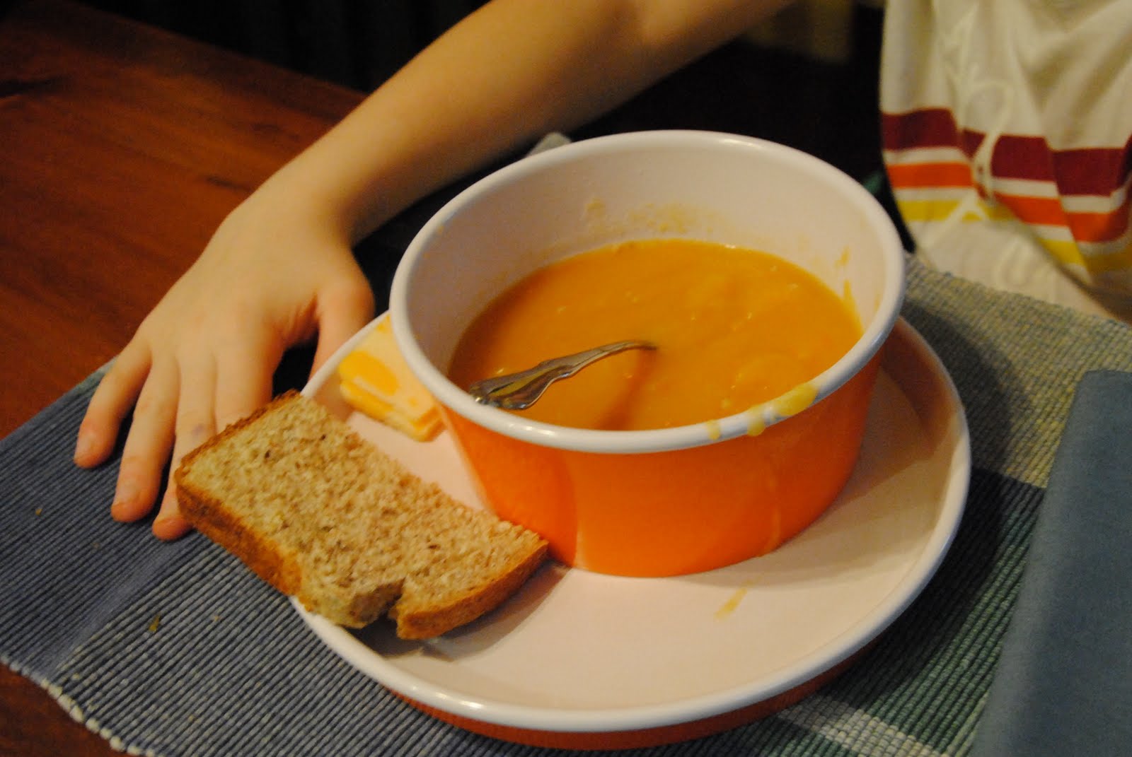 Monday supper. Carrot soup with potatoes, vegetarian version (I had run out of frozen chicken stock). It lacked the oomph without the stock flavours to balance it out. Passable. Cooked in the crockpot. Pureed just before setting it on the table. Swim lessons after school. The kids are enjoying it more than they’d expected. Fooey’s class was in the deep end, in the same lane where I swim in the mornings. I ducked out after supper to meet my siblings for a beer. Half a beer, and a ginger ale, in my case; spin class early tomorrow morning.