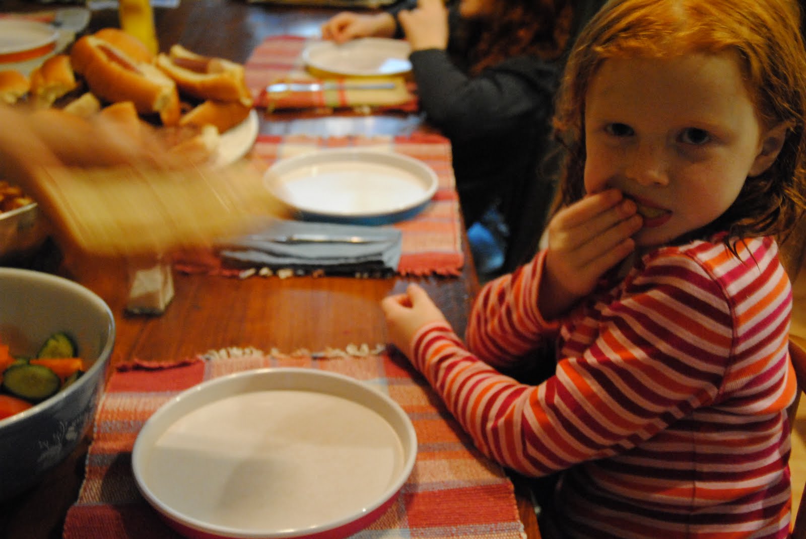 Thursday supper. Sweet and sour chicken and tofu in the crockpot (oh, and a bit of leftover beef and brocolli, too). Served with baked rice. Kevin got up early this morning for yoga, so we are back to our regular schedule. The kids and I enjoyed playing with friends in the morning, then dashed to the grocery store. I also baked bread, made yogurt, and supper, and hung laundry in the early afternoon: domestic multi-tasking hell, to be perfectly frank. But it all got done in time for me to go to a vinyasa yoga class before supper where we tried a crazy upside-down hand-stand. We cancelled our babysitter due to AppleaApple’s soccer practice, which was then cancelled last-minute due to rain. Oh well. My dad and sister came over to practice the harmonies some more. Good feelings all around.