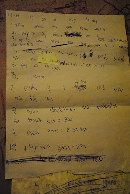 This was one well-planned party. I didn’t plan it, and neither did Kevin. It was planned in detail by the birthday boy, with some initial consultation (to whittle away at the more elaborate and impossible ideas). You can read the plan, on the right. In the end, the party went pretty much exactly like that (minus the 4am wake-up time).