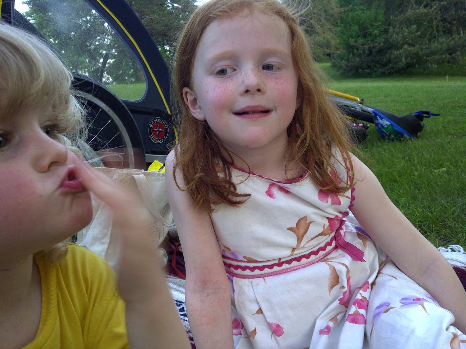 It was a busy day, but nevertheless, twice I found myself sitting on our picnic blanket with the two little ones, watching the clouds, collecting pine cones, listening to them play, watching them run and jump and climb trees. We whiled away part of the afternoon in our front yard. And we were able to bike to the park for AppleApple’s soccer practice. It meant a late evening for everyone, but worth it.