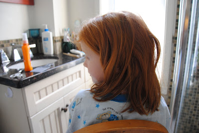 Just a trim. And the application of a brush to certain rarely-brushed peaks at the back of the head. (We should probably do that more often.) End result: she was pleased.