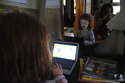 That’s funny–I can’t really see it, but she does look much littler to me dressed in her pjs and focussing on the computer.