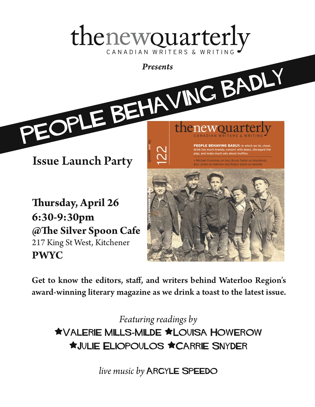 A quick post on a busy day. First, must let you know about an event taking place tomorrow evening, at which I will be reading: at The Silver Spoon in Kitchener, and I’ll be going on around 7:45/8pm. (I probably won’t be behaving too badly, however, contrary to the poster’s title. Which could be a disappointment, I realize.)