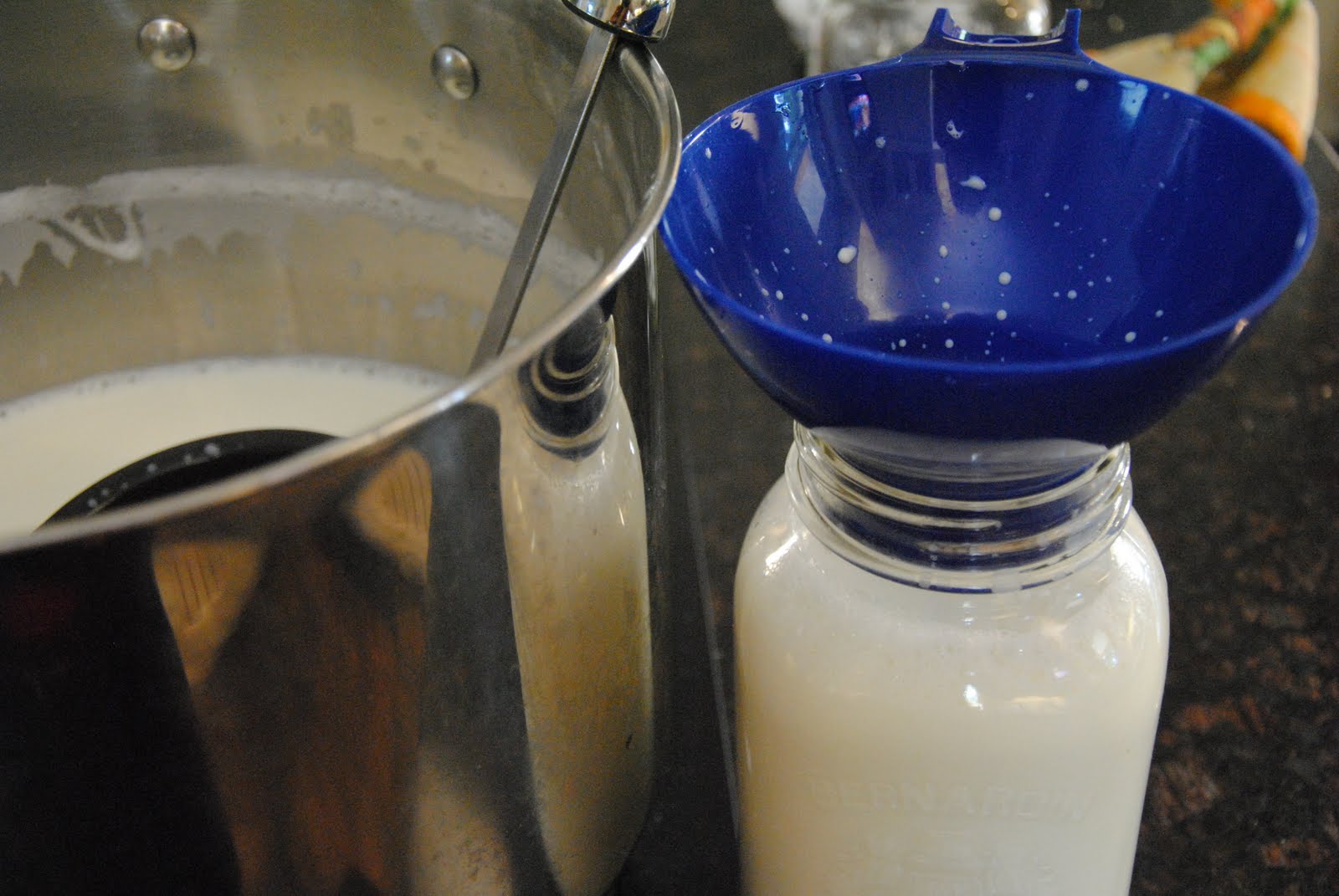 Now, pour the prepared milk into jars leaving some space at the top, add lids, and place into the warm innards of the heated-up cooler. Don’t lift the lid for seven or eight hours. In the wintertime, you may need to check that the water is hot and the temperature approximately 90 degrees F; right now, not so much.
