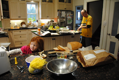 Not sitting here with the inspiration to write. But look at these photos. Yesterday, Kevin and Albus cooked the evening meal together: coconut chicken with baked rice, bouillabaisse, and fruit smoothies for dessert. Last Sunday, Fooey and Kevin cooked French onion soup (above, Fooey is monitoring the progress of the toasting bread in the toaster oven). Their other memorable meal item was a cheese and fruit plate for dessert.