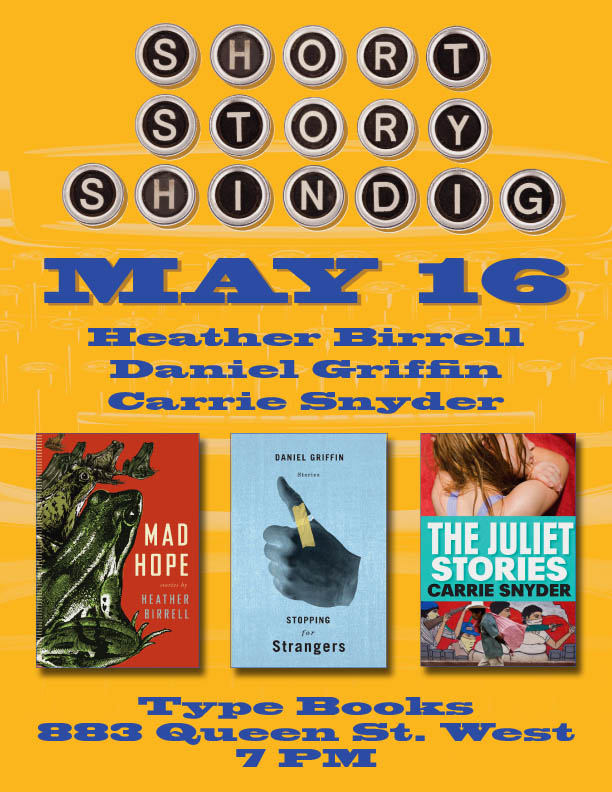 May 16 (Wednesday): Short Story Shindig at Type Books in Toronto! 7-9pm. I’m reading with Heather Birrell and Daniel Griffin, and our host for the evening is the most awesome Kerry Clare (who writes the best book blog on the block, Pickle Me This).